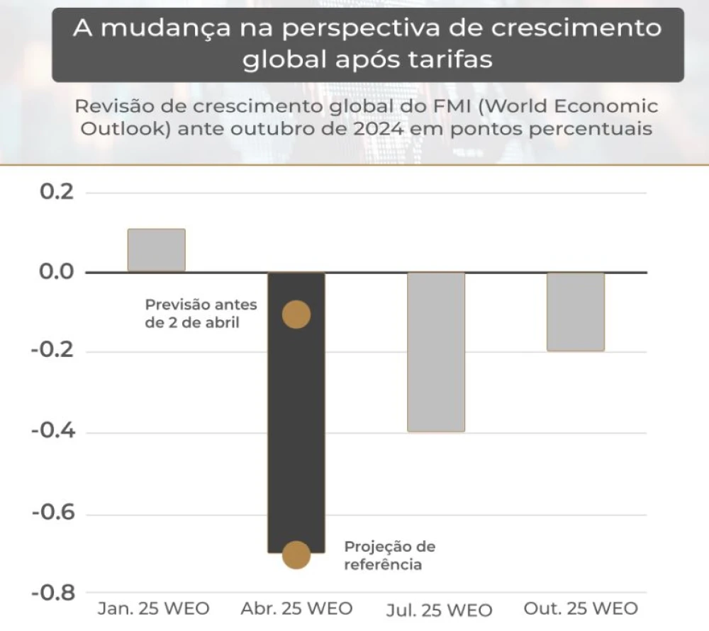 "A experiência passada sugere que pode levar muito tempo até que o quadro completo apareça. Até agora, a incidência das tarifas parece recair diretamente sobre os importadores dos EUA, com os preços de importação (excluindo tarifas) praticamente inalterados e aumentos limitados nos preços ao varejo", destaca o FMI em seu relatório World Economic Outlook (WEO) de outubro.